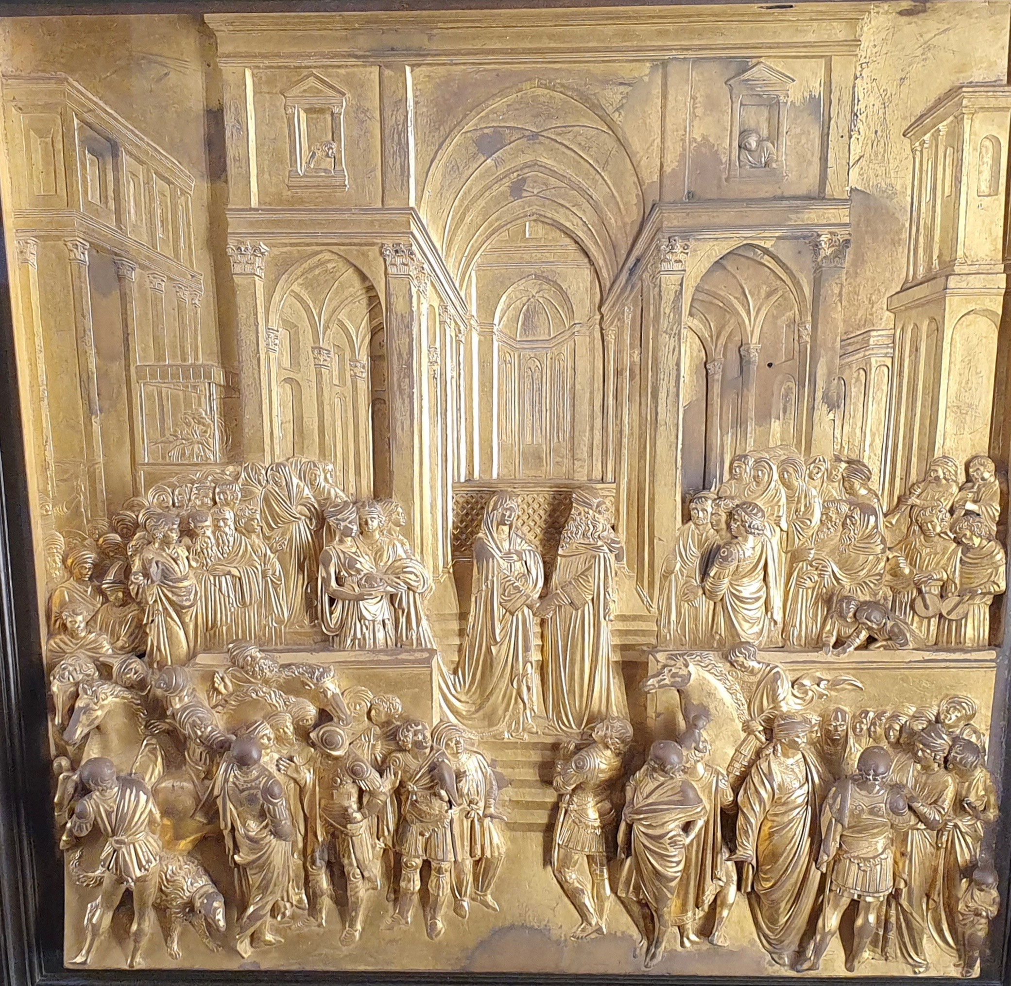 Wikimedia Commons, Lorenzo Ghiberti's Solomon and the Queen of Sheba engraving, found in the "Gates of Paradise" East Doors of the Florence Baptistery, bronze, from 1425-52