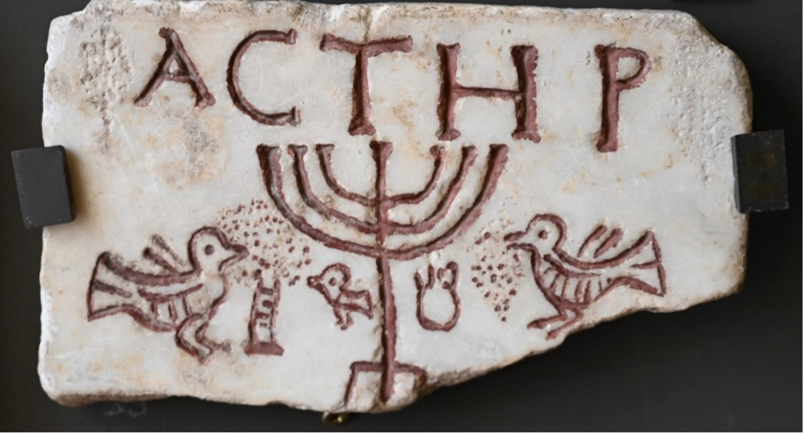 The Aster funerary epitaph (CIJ I 306 = JIWE 91) was discovered in the catacombs of Monteverde near the Via portuense, south-west of the city of Rome, and dates probably to the second half of the 3rd century CE. In style, it aligns with other Jewish epitaphs found in Rome. Such epitaphs were usually inscribed in Greek, as is the case here. Images of menorahs or a short formula in Hebrew characters such as “peace” or “peace upon Israel” could be engraved alongside the inscription. The very short text of this epitaph (astêr), could refer to the name Esther, or could mean “star”, and may be read as an indication of hope for life after death. The rest of the epitaph’s decoration features a menorah flanked by birds, a motif very common on funerary inscriptions in the catacombs of Rome. This motif is commonly regarded as Christian and is often depicted alongside Noah in his ark or accompanied by a chrism (see ICVR IV, 12295; ICVR VIII, 20769). As a Christian motif, it can be read as the dove of peace or a representation of the Holy Spirit as it appears in baptism scenes in the Gospels.