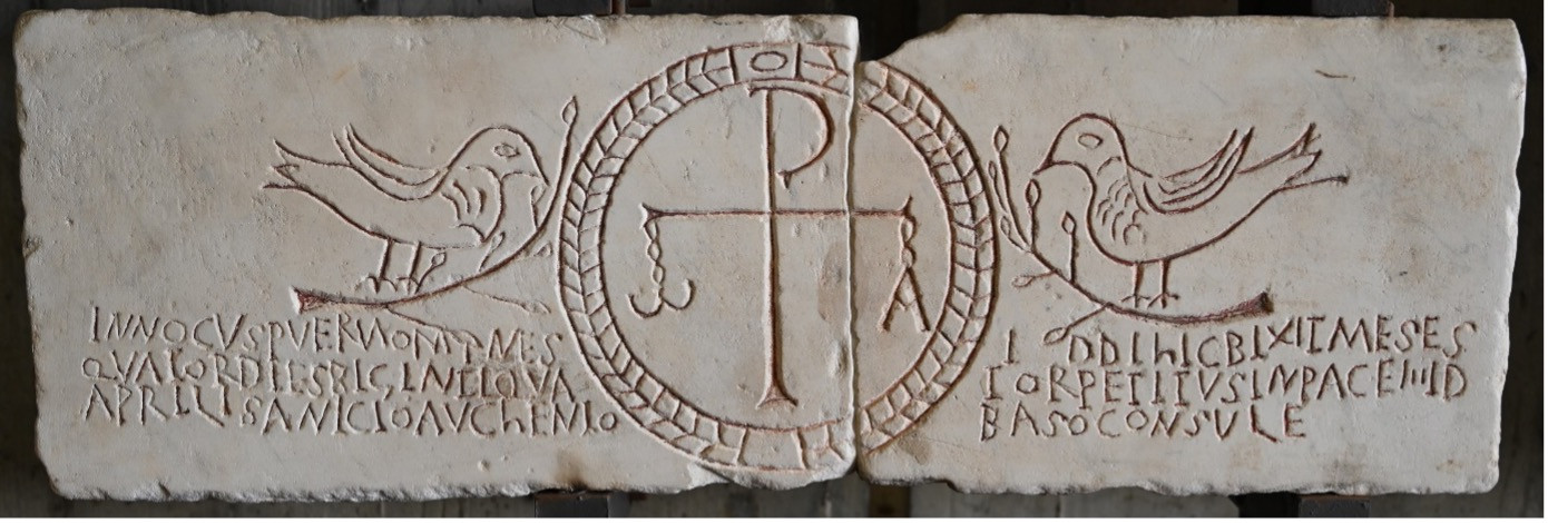 Co-production, however, can also go beyond the simple use of a shared motif. A new iconographic composition (scheme)was created by the mix between the catacomb’s decorative tradition (the framing pair of birds) and the increasing appeal to display religious signs such as menorahs and chrisms on graves. This is evidenced by a later Christian epitaph found in the catacombs of S. Commodilla that uses the schema of the bird framing a religious sign in the same way as seen on the Aster epitaph. This gravestone closed the burial place of a child named Siddi (or Siddinus), who died at the age of five months. In the 5th century, birds were still utilized on funerary inscriptions and are found here in the same composition, with the exception that the birds frame a chrism with an Alpha and an Omega instead of a menorah.
