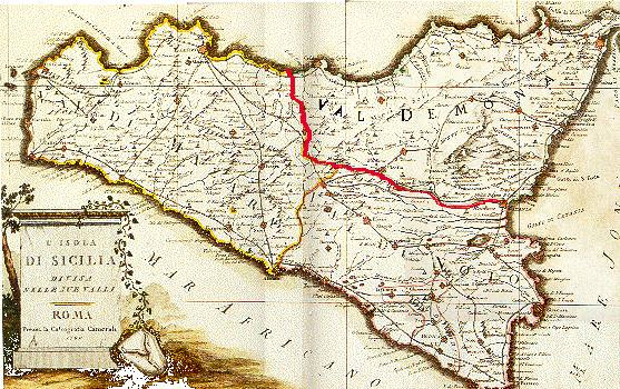 18th-century map drawn by the cartographer Giovanni Maria Cassini, representing the division of Sicily into the three Valli, with the Val Demone in red (Wikimedia Commons)