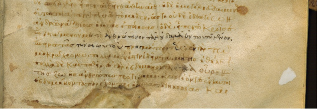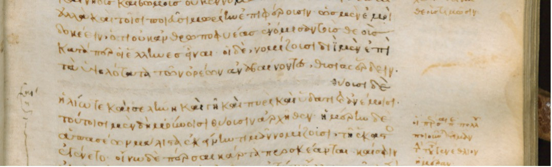 Figures 2 and 3 offer snapshots of his working methods. The former shows a passage in the middle of Herodotus’s description of the theology of the ancient Persians, important for Gemistos who considered them the disciples of Zoroaster. Today most of a line of text is missing, deleted by Gemistos because it contradicts his own theology. Figure 3 shows a more subtle technique. In a speech given by the ancient Greek sage Solon, Gemistos has erased part of two lines, which he considered blasphemous, and inserted his own replacement, written in a careful imitation of the author’s style and dialect. The new text, in darker ink, brings Solon’s words closer to Gemistos’s own neo-Platonic orthodoxy and removes the pessimistic idea that God disrupts human life out of a malevolent “jealousy” felt towards humanity.