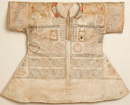 Talismanic Shirt with Depictions of the Two Holy Sanctuaries, Mughal India or the Deccan. 16th or early 17th century. Material: ink, colored pigments and gold on cotton. Khalili Collection of Hajj and the Arts of Pilgrimage. Link here.