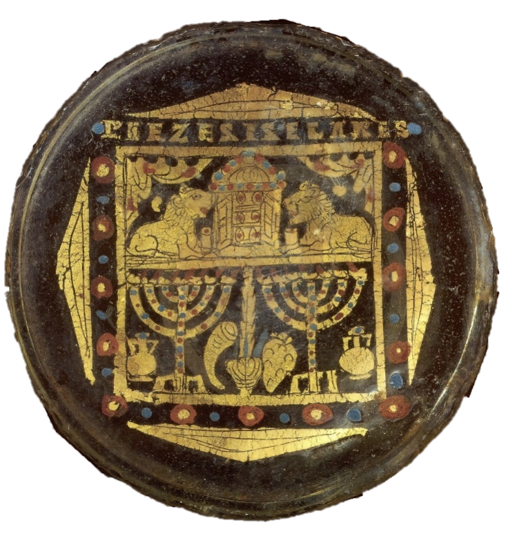 This gold-glass from the 4th century, now in the Israel Museum in Jerusalem, shows a medallion divided into two registers: the upper half displays the Torah shrine flanked by two lions holding a scroll, while the lower register shows two menorahs, as well as other traditional elements of late antique Jewish iconography (the citrus fruit etrog, the palm tree lulav, the shofar horn, etc.). The inscription PIE ZESIS ELARES is relatively common and is part of the usual epigraphic repertoire of this type of material. Here in latinized Greek we read: “Drink, that you may live.” The provenance of the object is unknown, but it is believed to have come from one of the many catacombs in Rome, as this is where the majority of the 500 to 600 objects of this type that have been discovered to date come from. Interestingly for our investigation, only 16 of these gold-glasses feature Jewish iconography such as shown on our source. Apart from a few exceptions, none of them have been found in situ.
