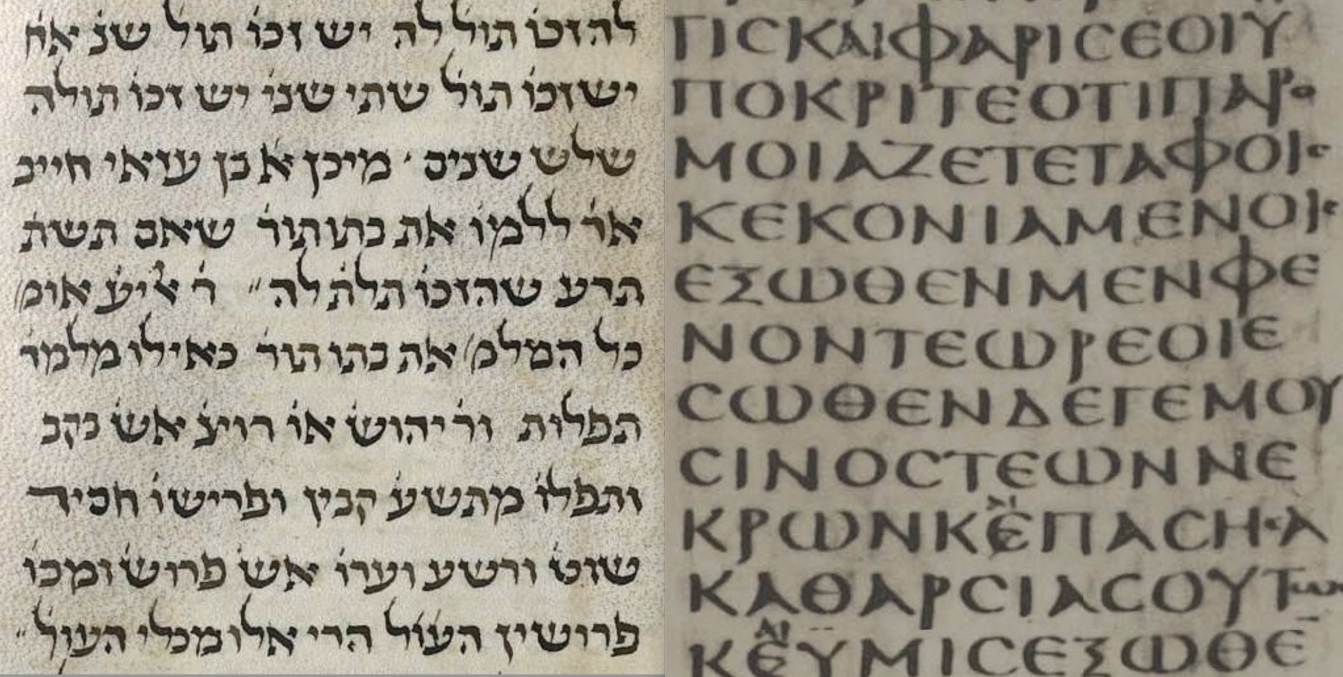 Left: Munich MS 95 (1342 CE), p. 504 (discussion of pharisees from tractate Sotah 22b); Right: British Library MS Add. 43725 (= Codex Sinaiticus; 4th cent.), unnumbered folio (Jesus' words from Matthew 23:27a)