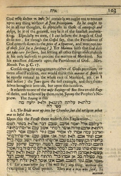 Given the strong Christian tendency to understand its norms as authorized by Hebrew scriptures, it is not surprising that Gregory puts his historical scholarship to the work of establishing a prophetic origin to this teaching. “The Jewes gave the first example, and they themselves brought it into use.” He cites the Aramaic Alphabet of Ben Sira, a medieval Jewish text composed in a Muslim context, but presenting itself as having been authored by Ben Sira--“beleeved by them to be Jeremie the Prophets Nephew”—in biblical times. The Alphabet tells the story of a groom who refused to say “God-willing” about his plans to be with his bride that evening, resulting in the death of both bride and groom. The bishop concludes: “Whosoever hath a purpose to doe any thing ought to say If God permit, Otherwise he is not like to prosper.”