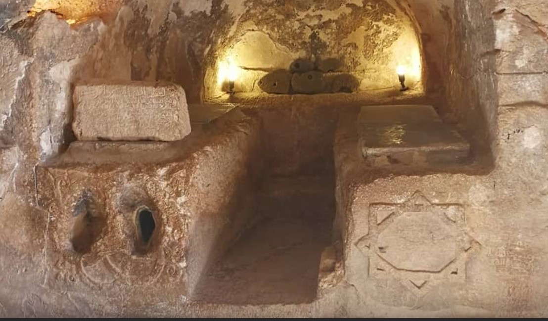 The cave entrance points south, aligned with the miḥrāb and Qibla. Inside the cave sit seven stone sarcophagi. Inscribed on one is the Byzantine Christian octagon. Next to it, a large hole is carved out, now covered with glass, through which visitors can see the bones of the buried. Inscribed on the wall on the left are the basmala along with Qur’anic verses in Kufic script.