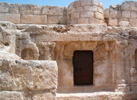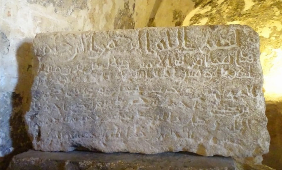 The cave in al-Rajib is flanked by remains of two mosques and a Byzantine cemetery. Two square stone pilasters and adorned niches from the remains of a Byzantine church line the cave’s entrance. An eroded mosque miḥrāb is embedded in the cave’s southern wall. Nearby are the foundations of a minaret, four Byzantine pillars fifteen feet apart, and an Arabic inscription stating that this (second) mosque was built by the son of Aḥmad ibn Ṭulūn (d. 884). Archeologists note that this structure was likely a Byzantine church converted into a mosque during the Umayyad caliphate of ‘Abd al-Malik ibn Marwan (d. 705), and later renovated under the Ṭulūnid dynasty.